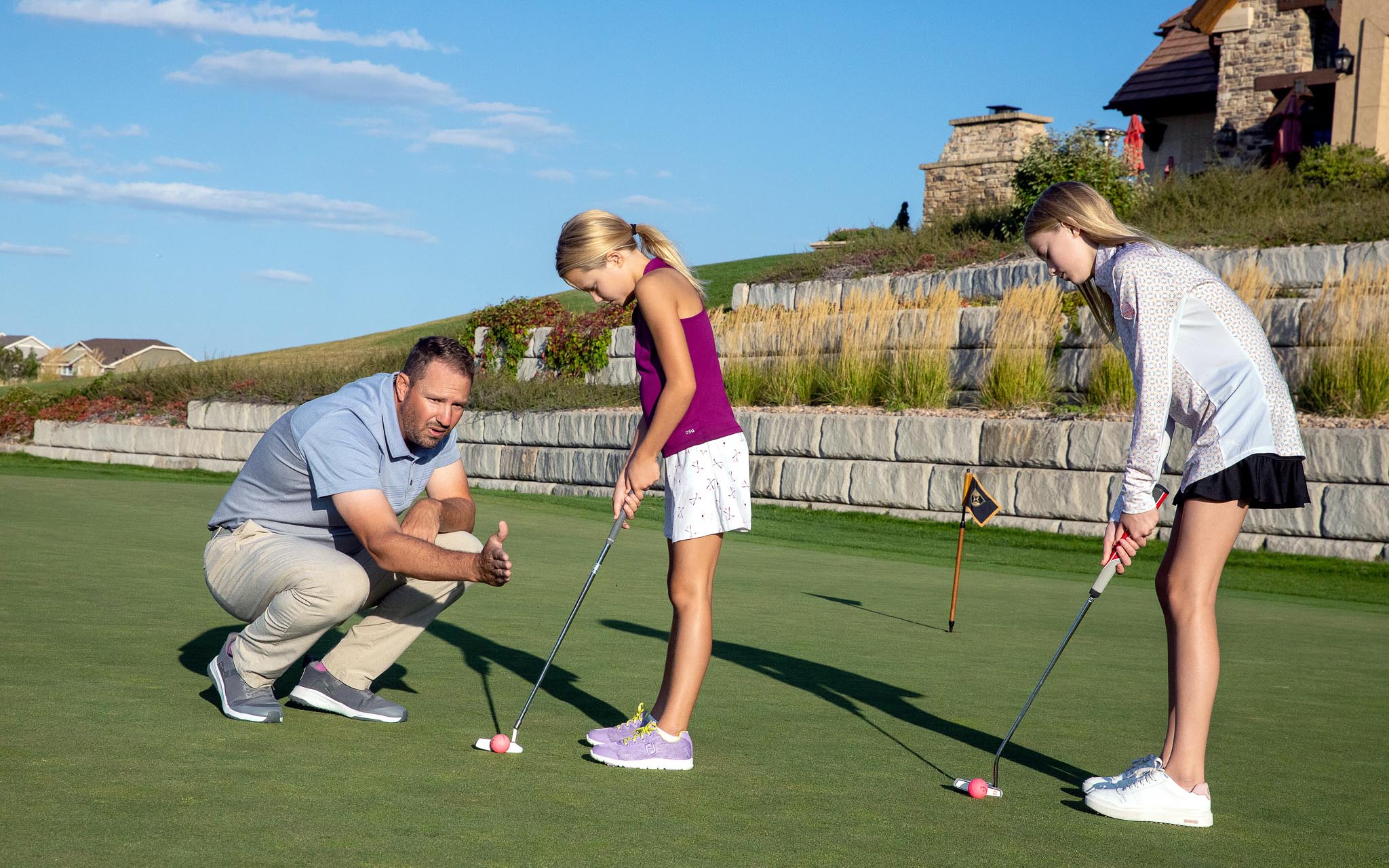 All golfers are expected to dress in proper golfing attire. Golf clothing of the type displayed in the golf pro shop is recommended. Collared shirts are required. No jeans, denim, running or jogging shorts, swimwear, tank tops, t-shirts, or flip flops are allowed on the course or the practice facilities.