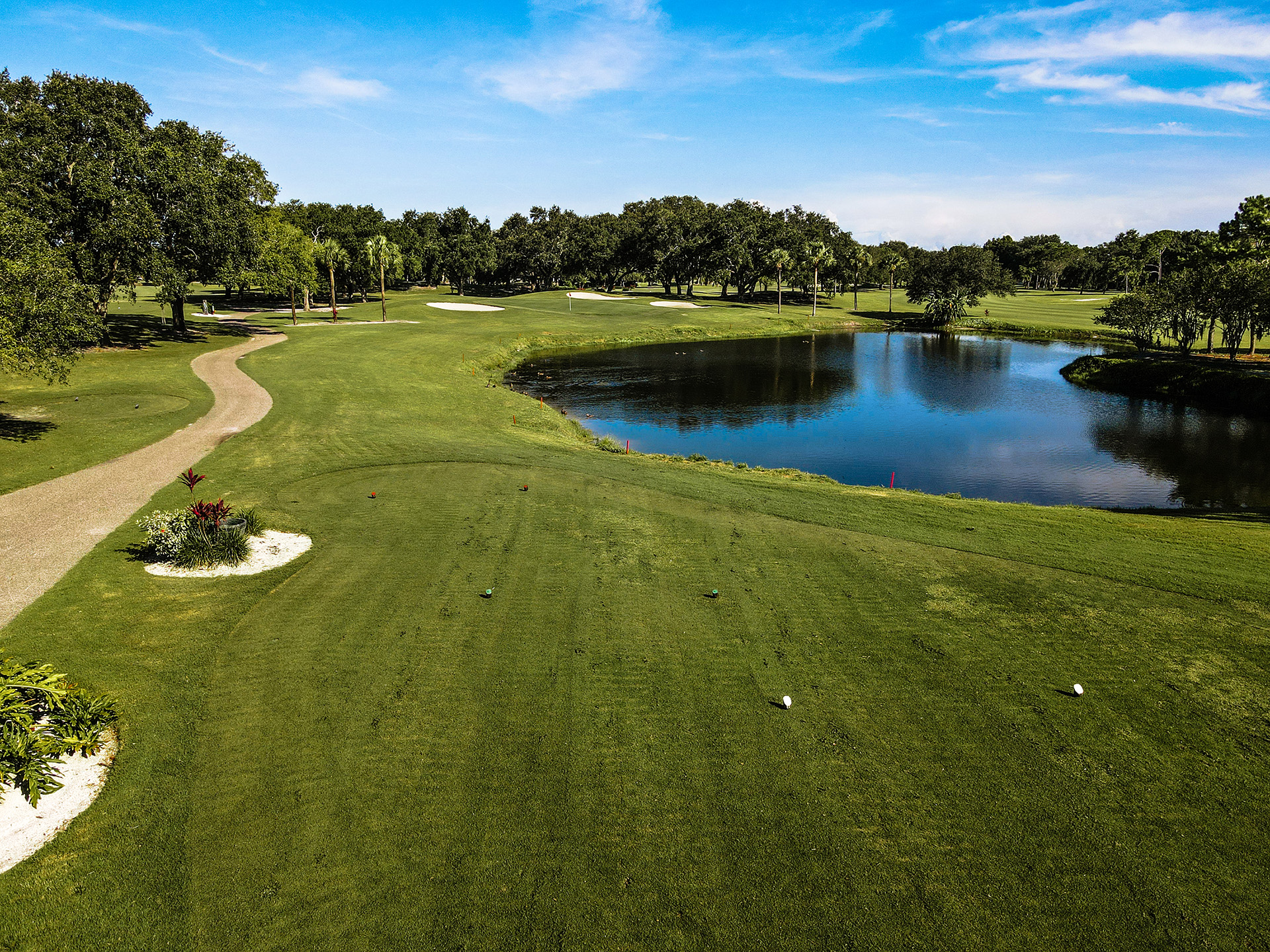 A tight Par 4 that has out of bounds of the left and water right. Keep your tee shot down the middle to set up a medium iron shot into the green.