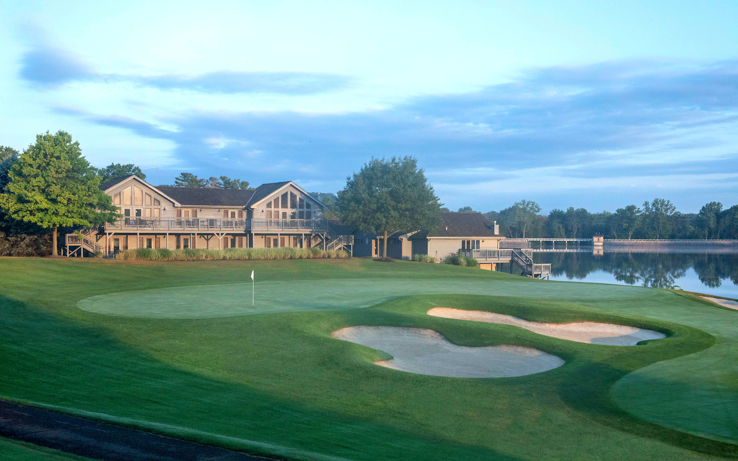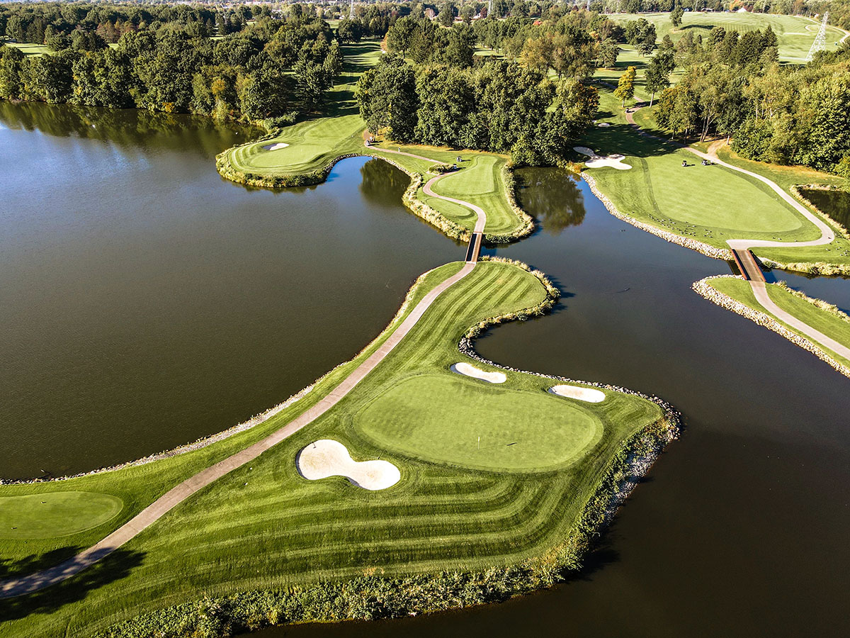 The final hole of the North Course is a 500-yard Par 5 across a large body of water. This hole is a true high risk-high reward. Longer hitters can cut off a lot of distance hitting over the larger part of the lake, leaving a short iron for the second shot into the Par 5. The safe play is to aim online with the club house and play the hole as a three-shot approach. Around 100 yards out from the green, a small canal connects a small lake to the large one. This canal is not very apparent and must be accounted for when laying up. The green is guarded by three bunkers around the front of the green. The green slopes back to front with subtle breaks depending on hole location.