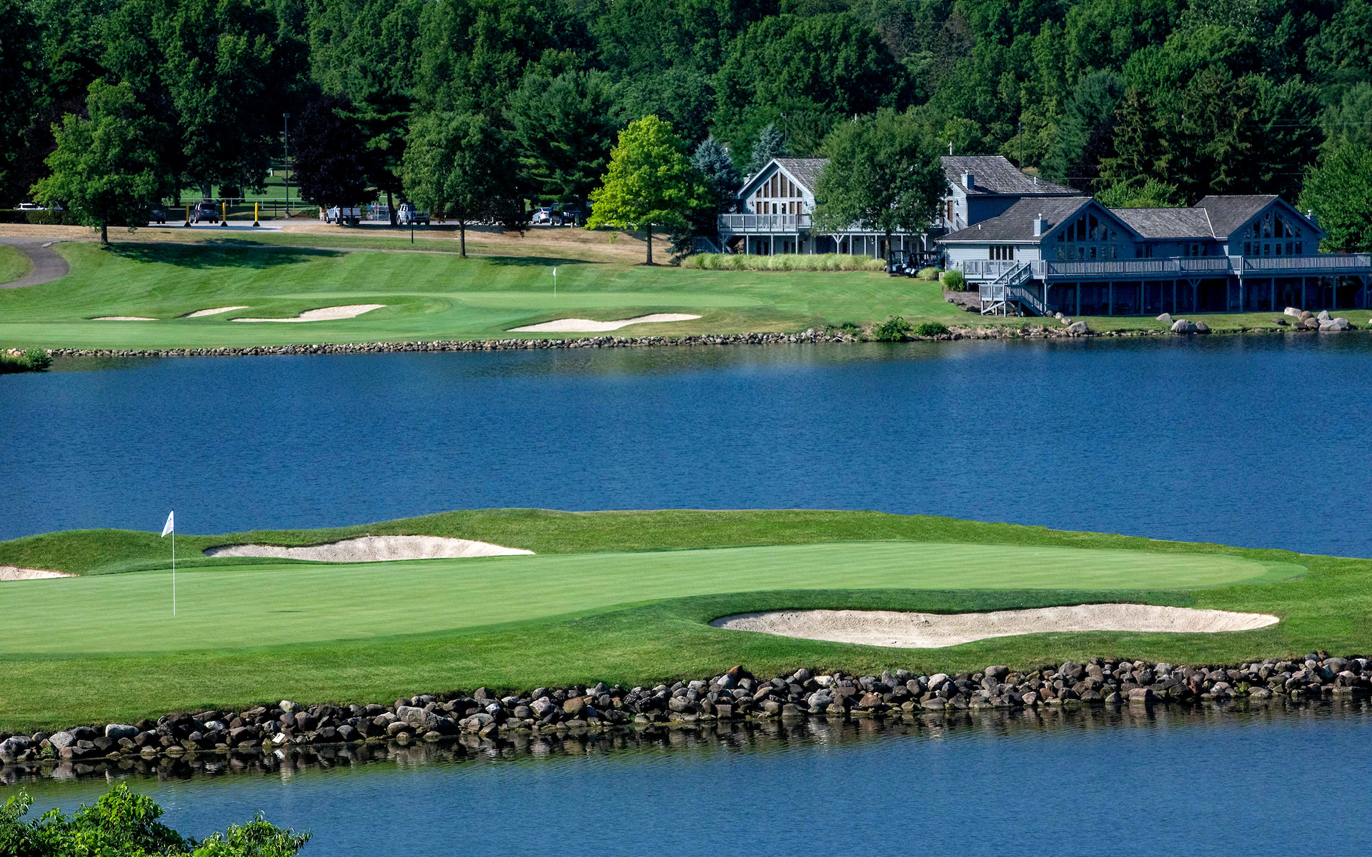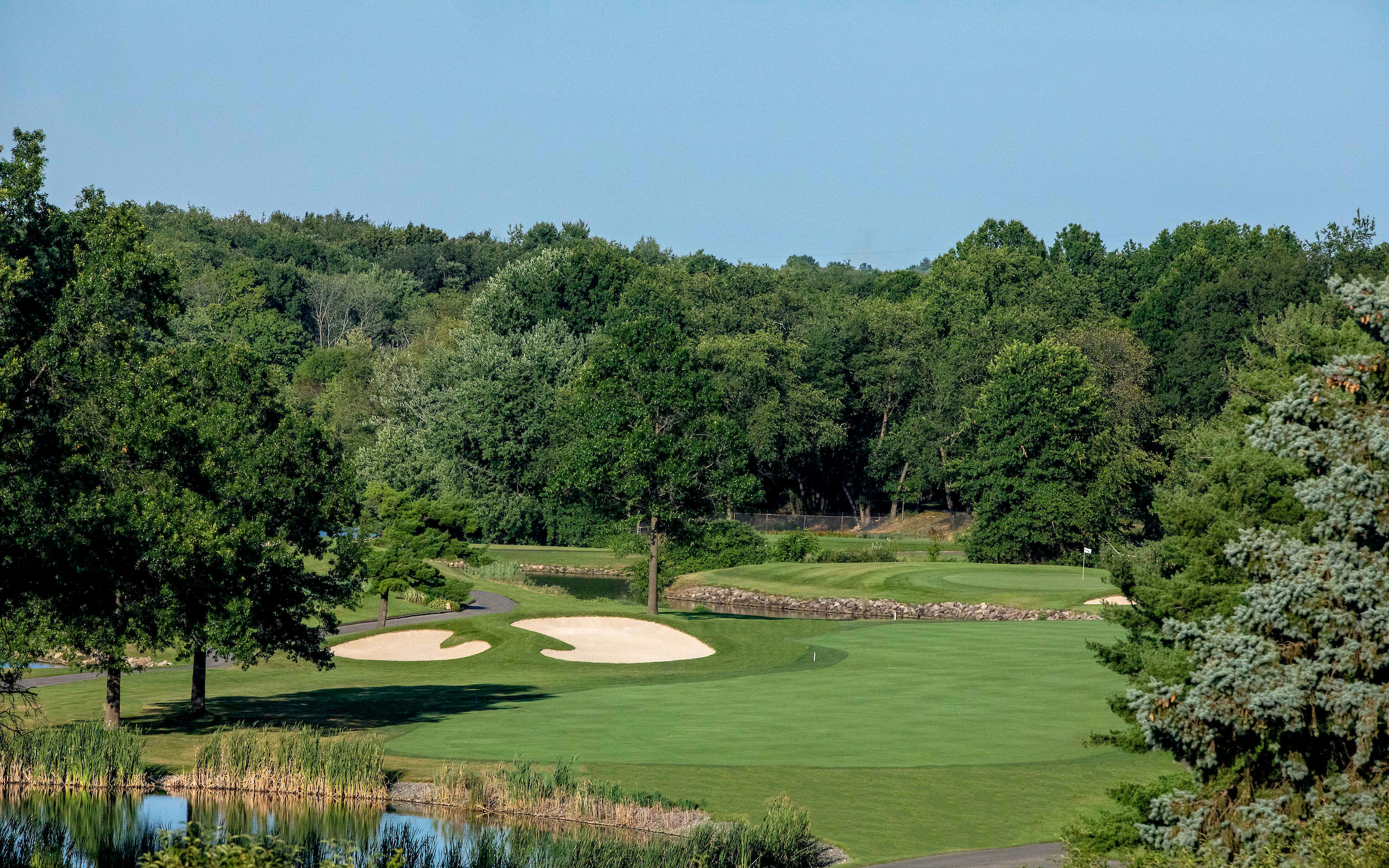 This slight dog-leg right plays just under 400 yards from the Member Tees. The tee shot on this hole is blind, but the target line is left center of the fairway as the fairway is sloped left to right. The fairway is lined on the right side by thick trees all the way up to the hole. The left side of the fairway is more open for a miss but going too far left will put the ball out of play in a thick wooded area. The approach shot into this elevated green requires full attention as missing the green can leave a tough up and down. Three bunkers surround the green as well as thick, rough. The green slopes back to front as well as hard left-right back towards the lake.