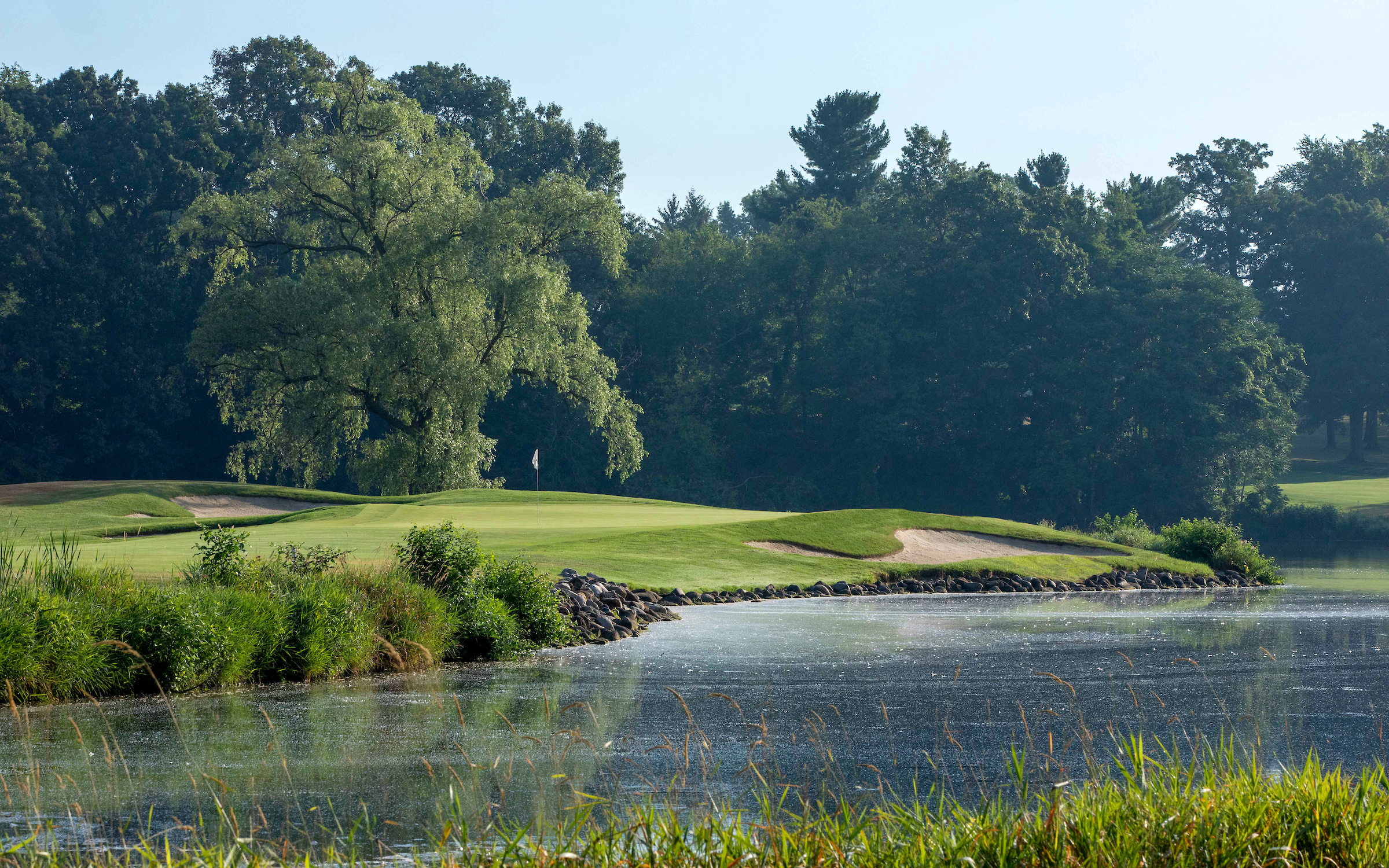 This short Par 4 is more about accuracy than distance. Playing only 335 yards from the Member Tees, it is not the easiest of Par 4s. With a large body of water lining the right side of the hole and deep bunkers on the left, it is important to be in the fairway. The shot into the green can be tricky depending on the hole location. The green slopes hard back to front and is slightly tiered. Three bunkers guard the green as well as a tightly cut runoff into the lake behind the green.