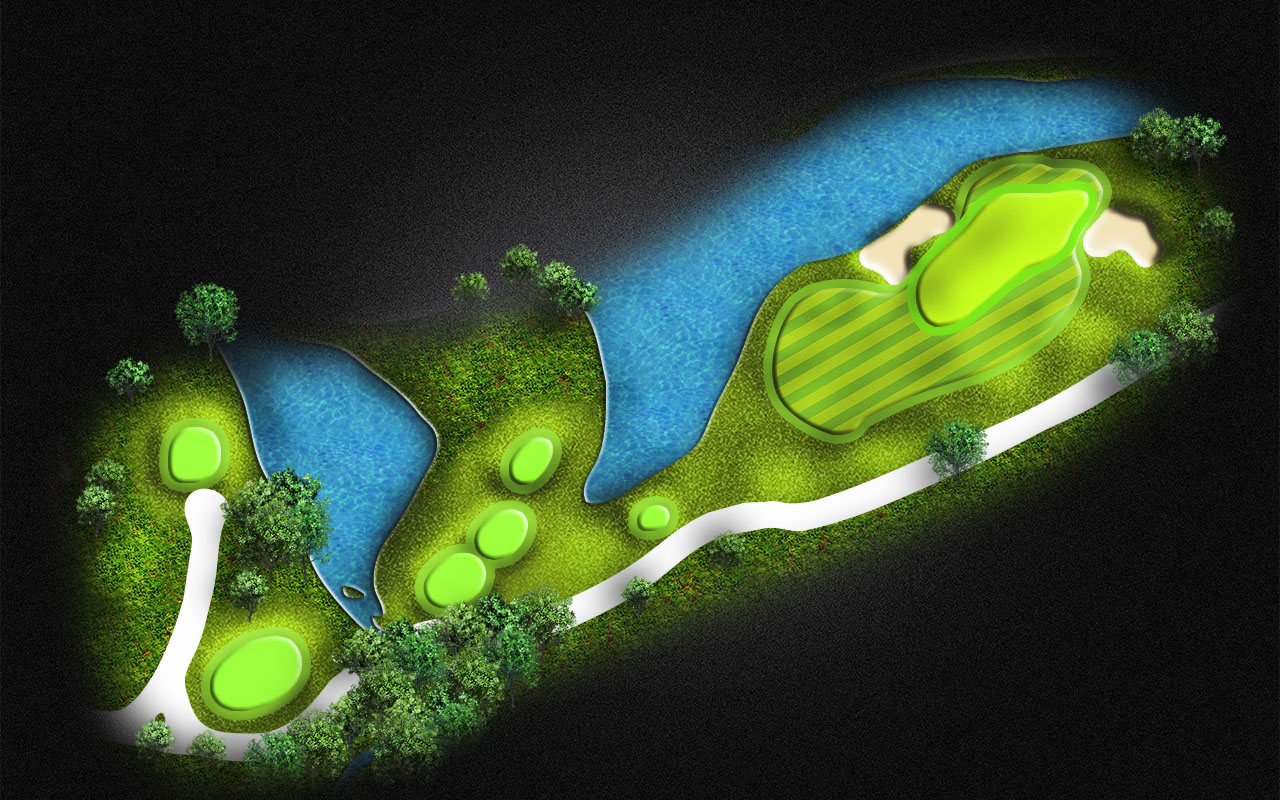 A demanding tee shot between 2 waters still leaves you a tough mid iron to the green surrounded by water on both sides. Drive it to the 150 yard marker gets you started on the last hole of the day.