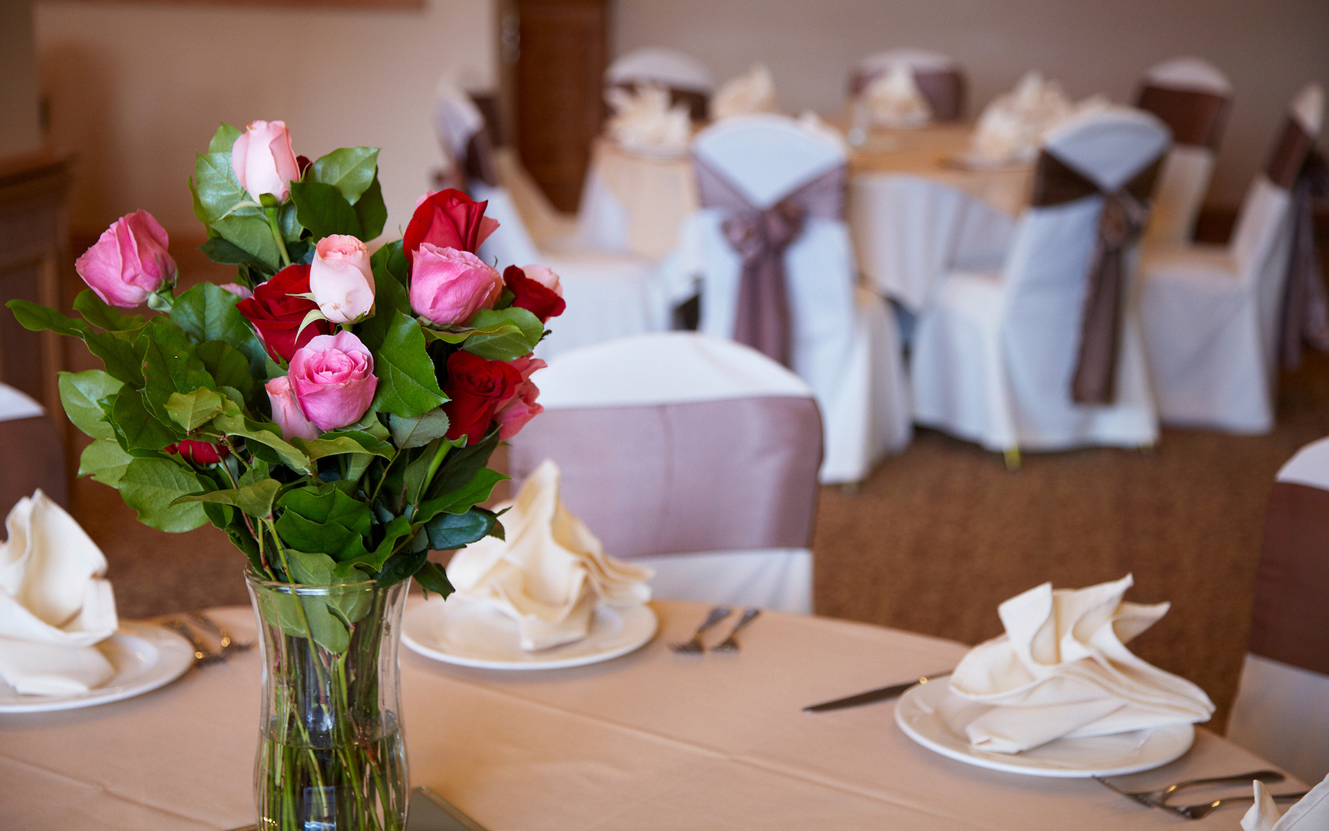 The Ballroom is comprised of three rooms, the Greenbrier, Chesapeake and Virginia Rooms which may be partitioned off for smaller private dining/meeting rooms. The sliding glass doors leading to the balcony are a welcome invitation for your guests to enjoy the fresh air and the beautiful view. The ballroom can seat up to 150 guests and host a standing reception for up to 200 guests. Opening the French Doors to the Fairway Room creates an elegant picture for your larger parties, seating up to 275 guests.
