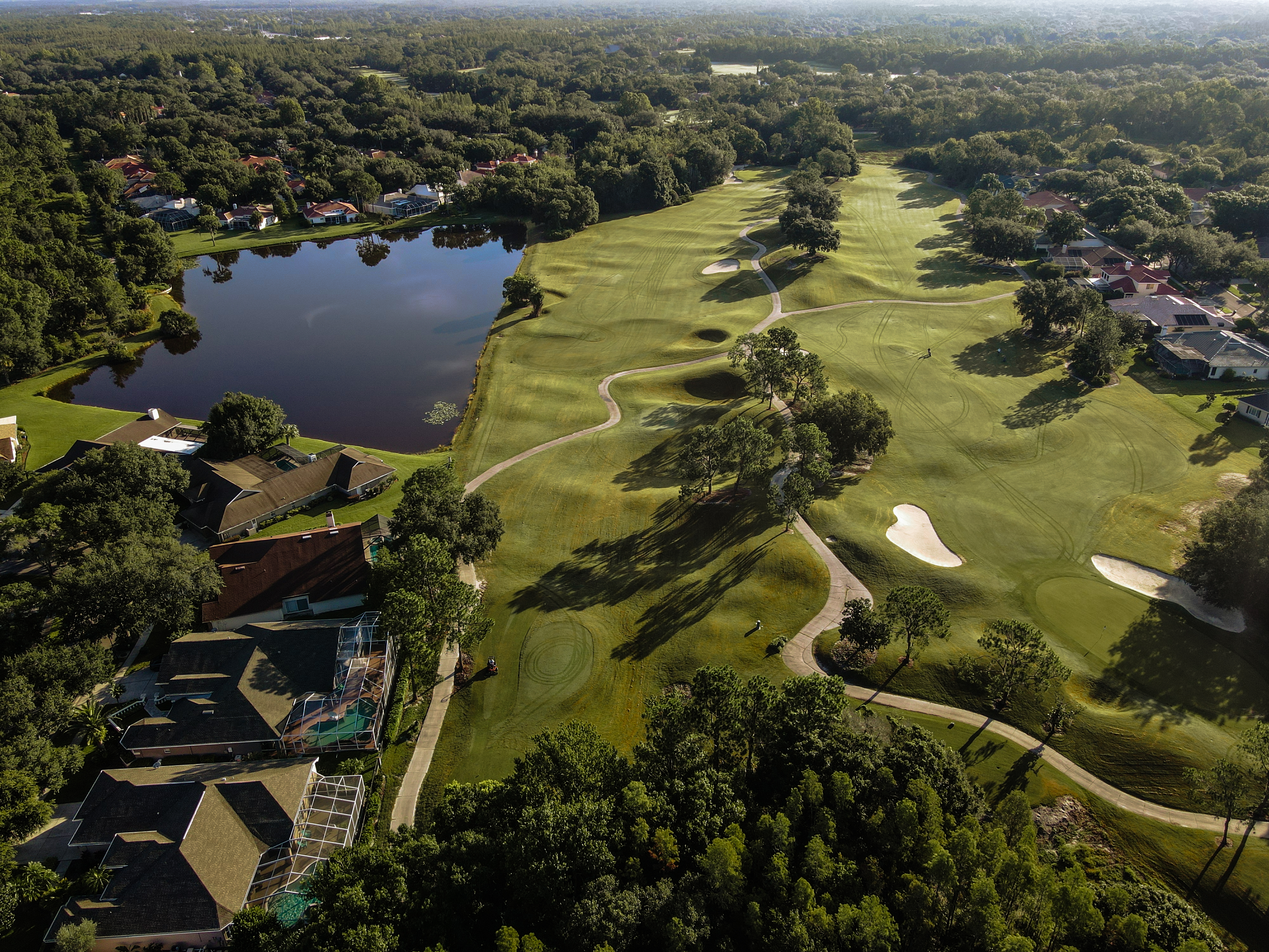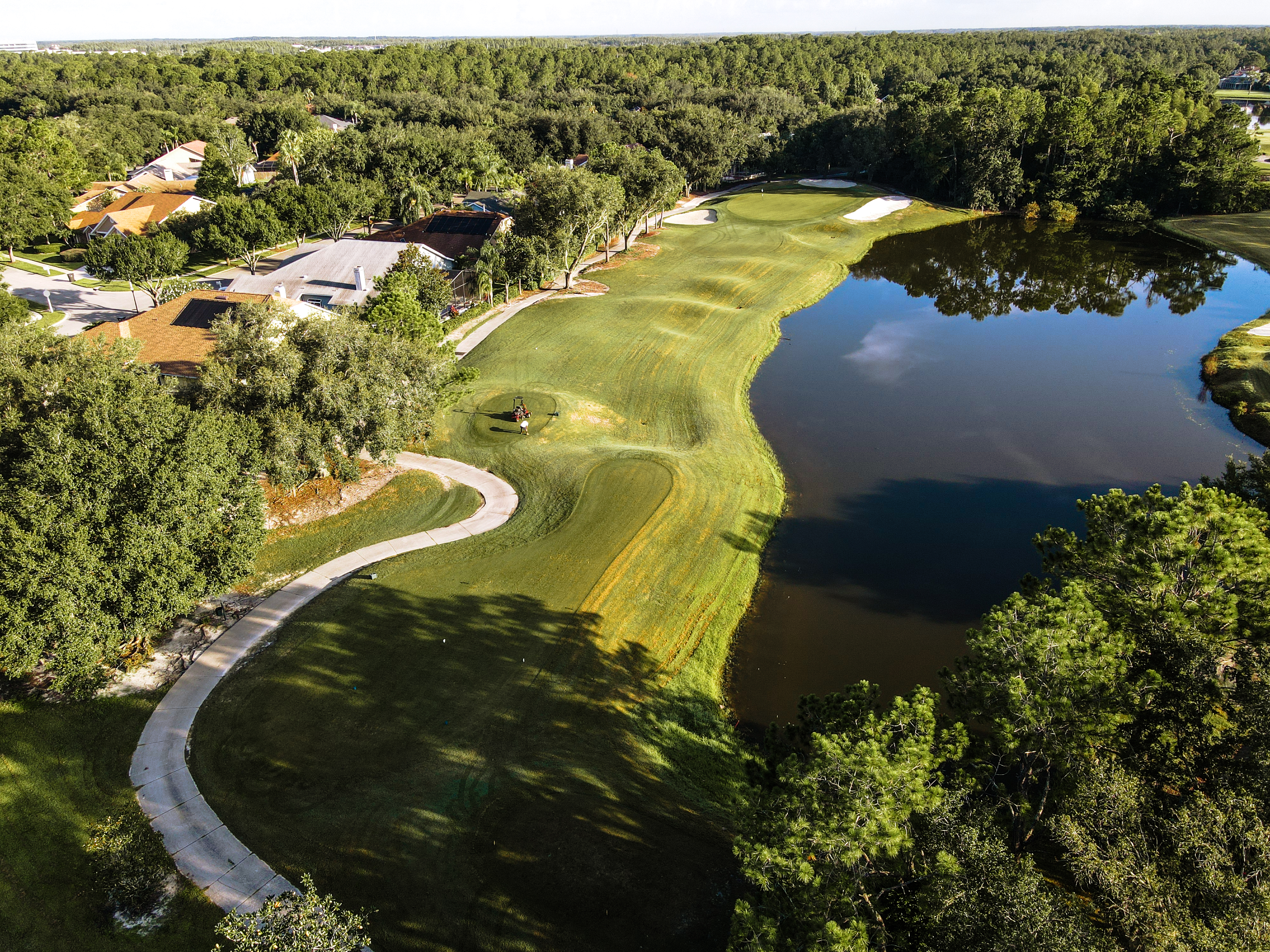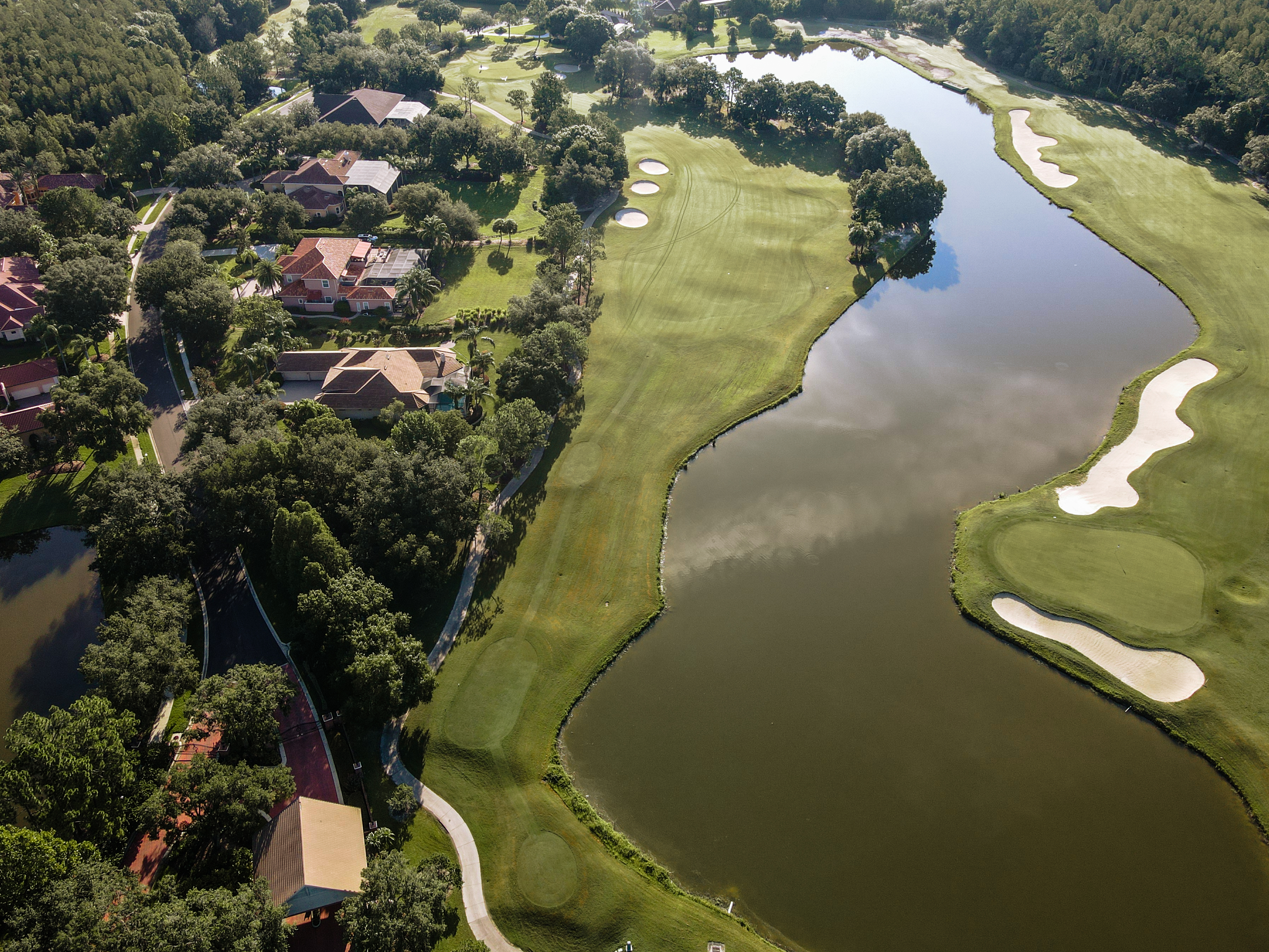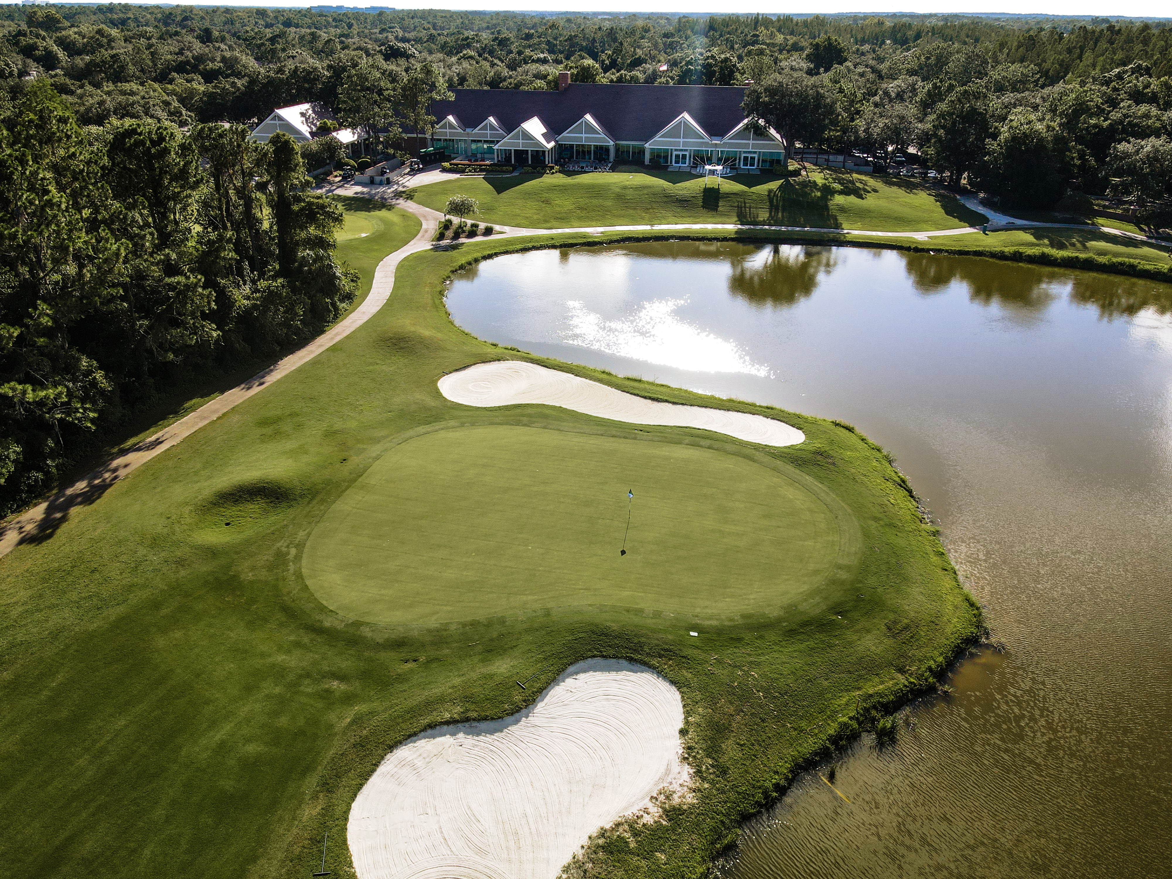 Our signature finishing hole is a par 4 with water down the entire right side of the hole offering a beautiful view of the clubhouse, putting green and 10th hole. There is room to play conservative down the left or challenge the lake on the right. The second shot is over the same lake to a green sloping from left to right. Be careful: The green is surrounded by bunkers and water.