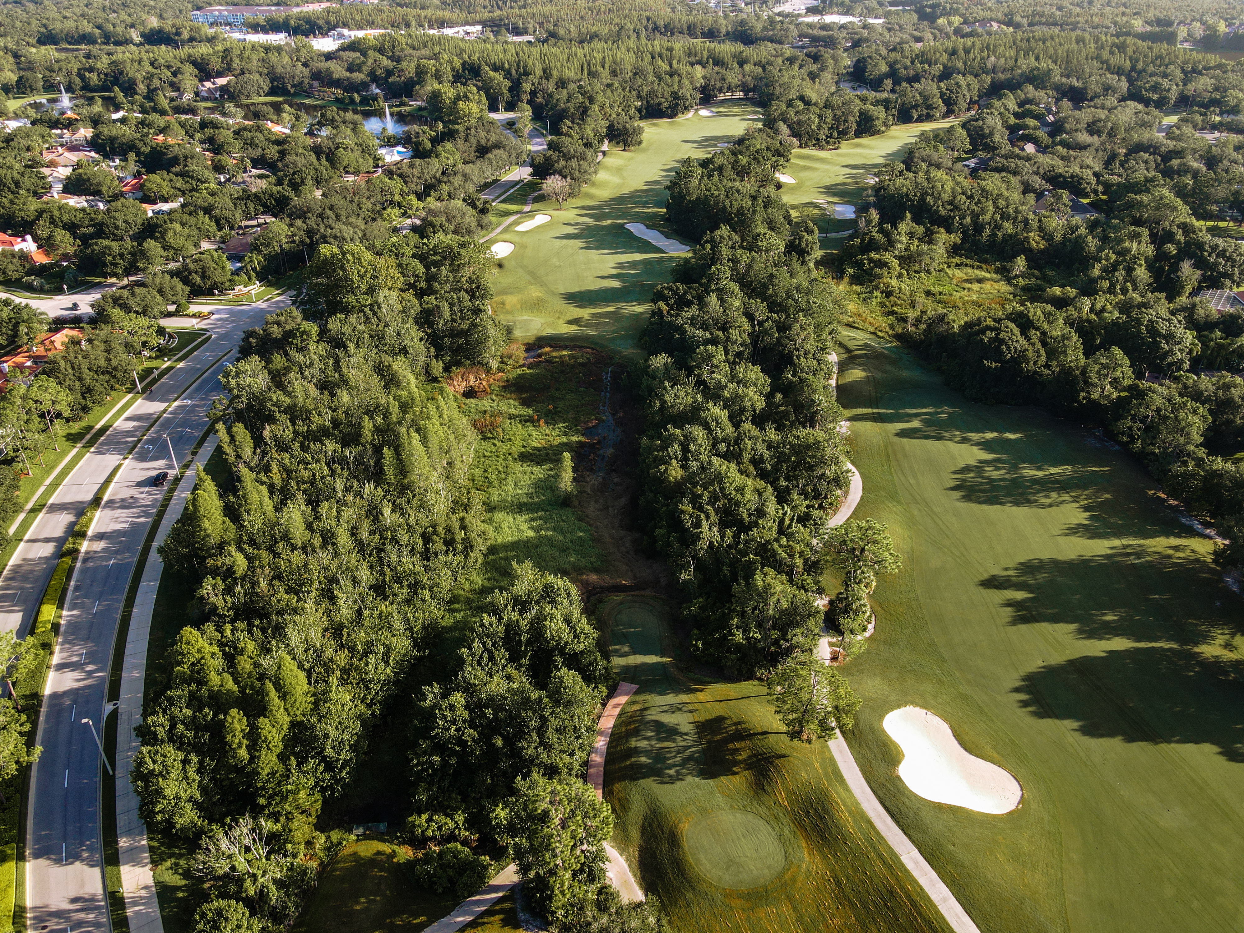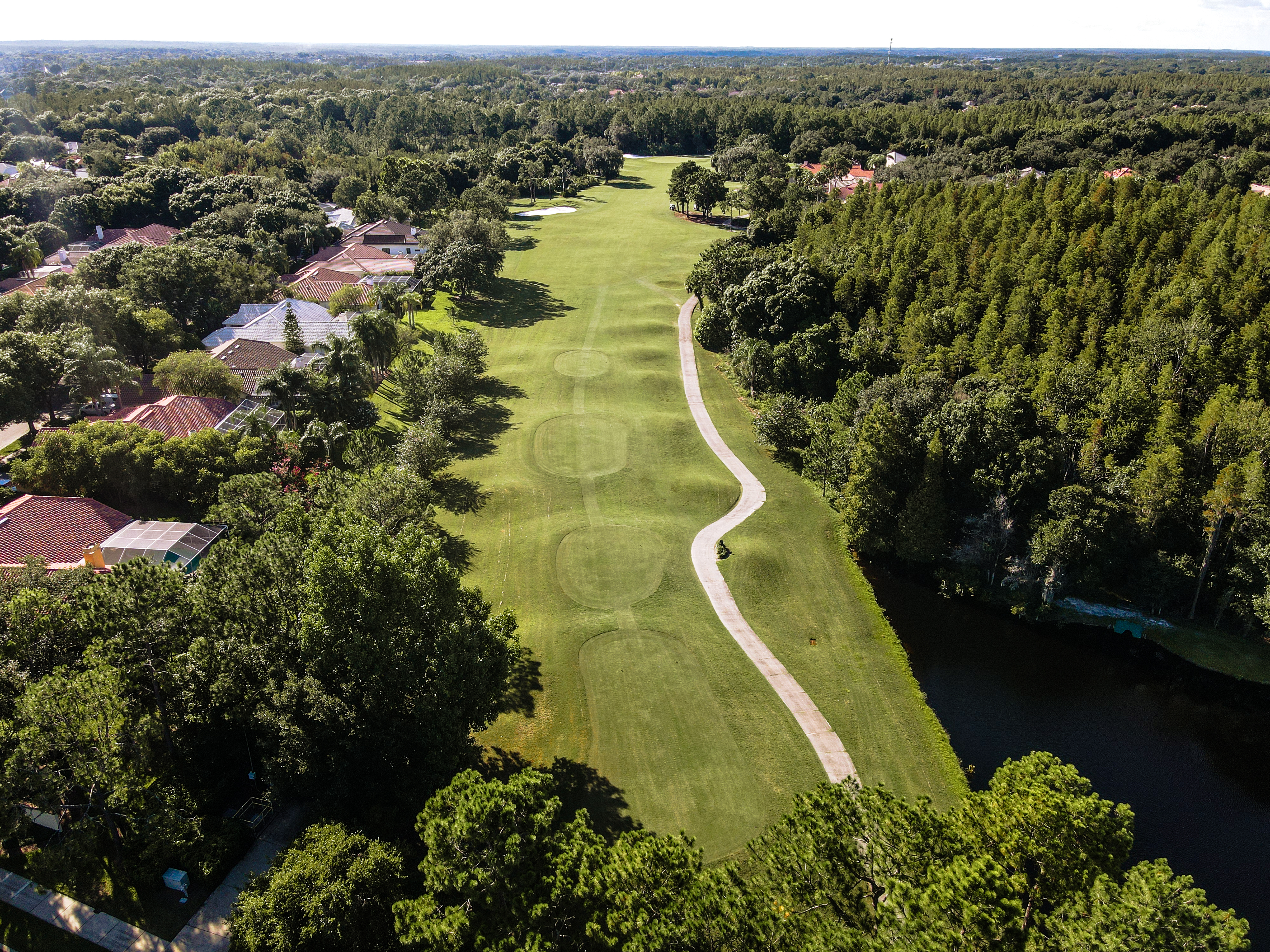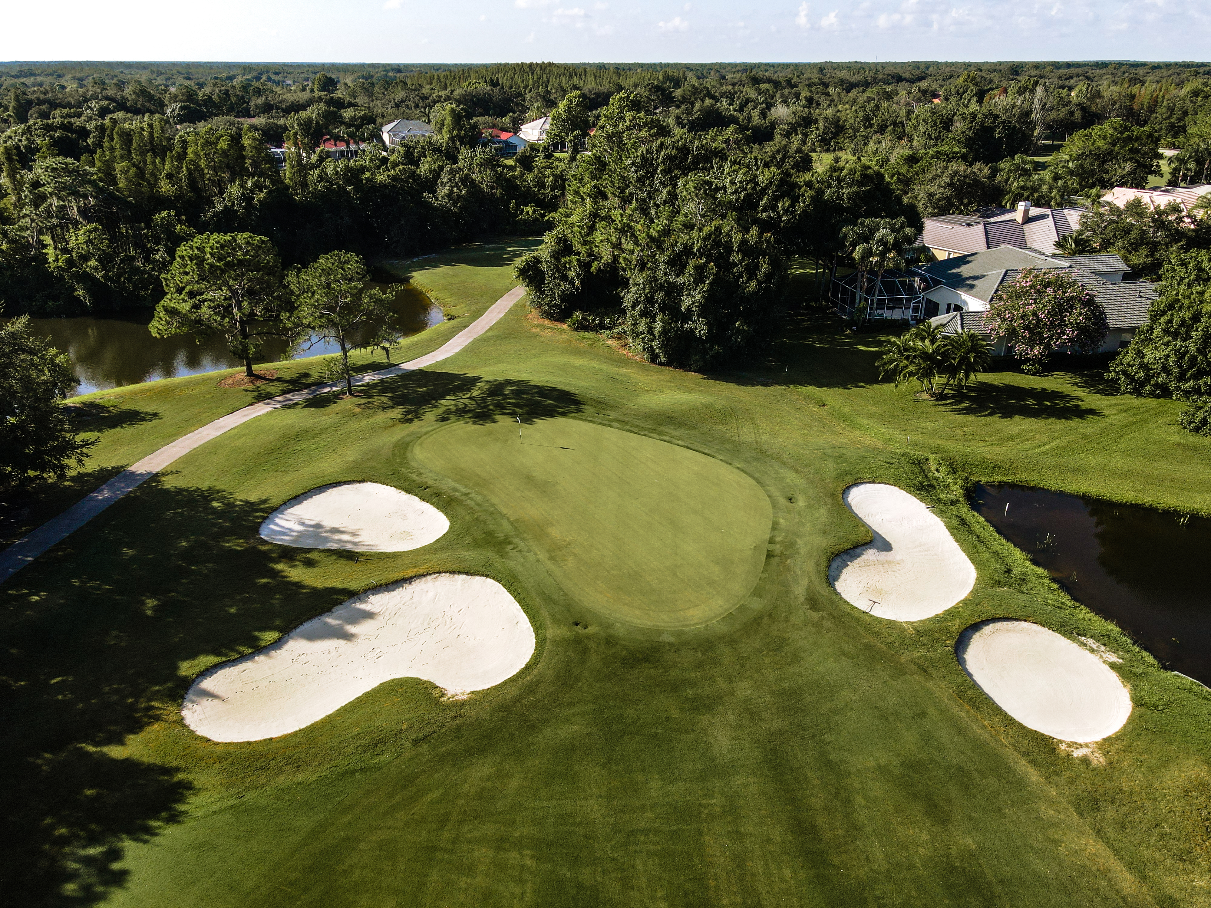 A perfect risk/reward par 5 that allows you a bail out to the left or take your chances navigating the water on the righthand side to set up a chance to hit this par 5 in two. The green is long and deceptively tiered.