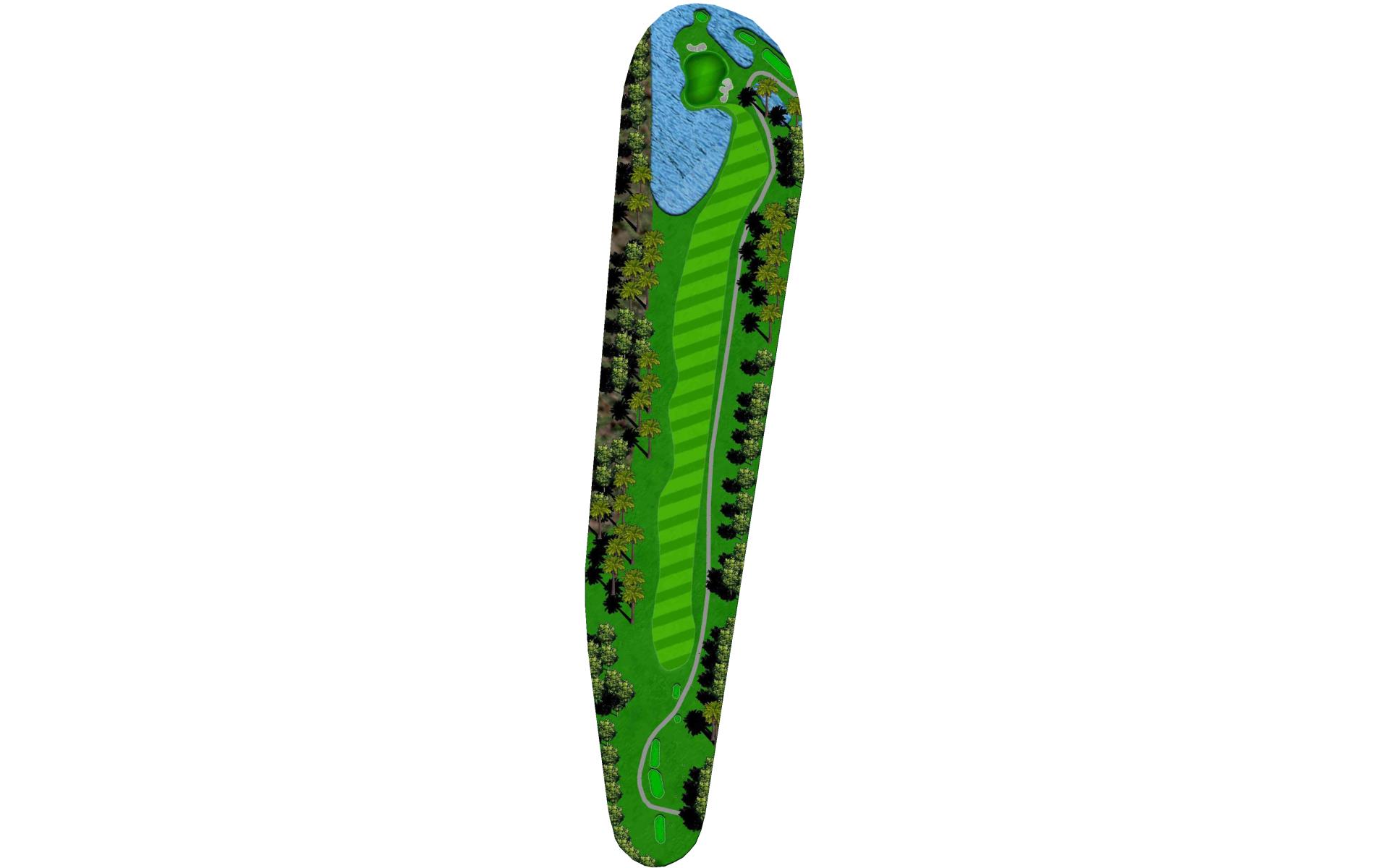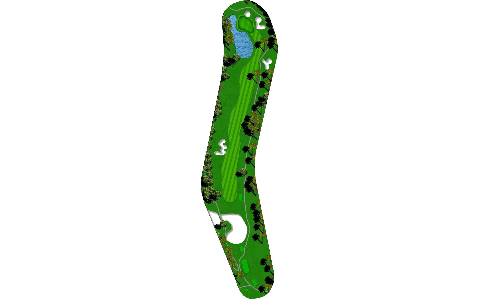 A long iron or 3 wood won't hurt here (bowling alleys are wider than this palm tree-lined fairway!). Stay short of the water and your third shot will find the green without a problem.