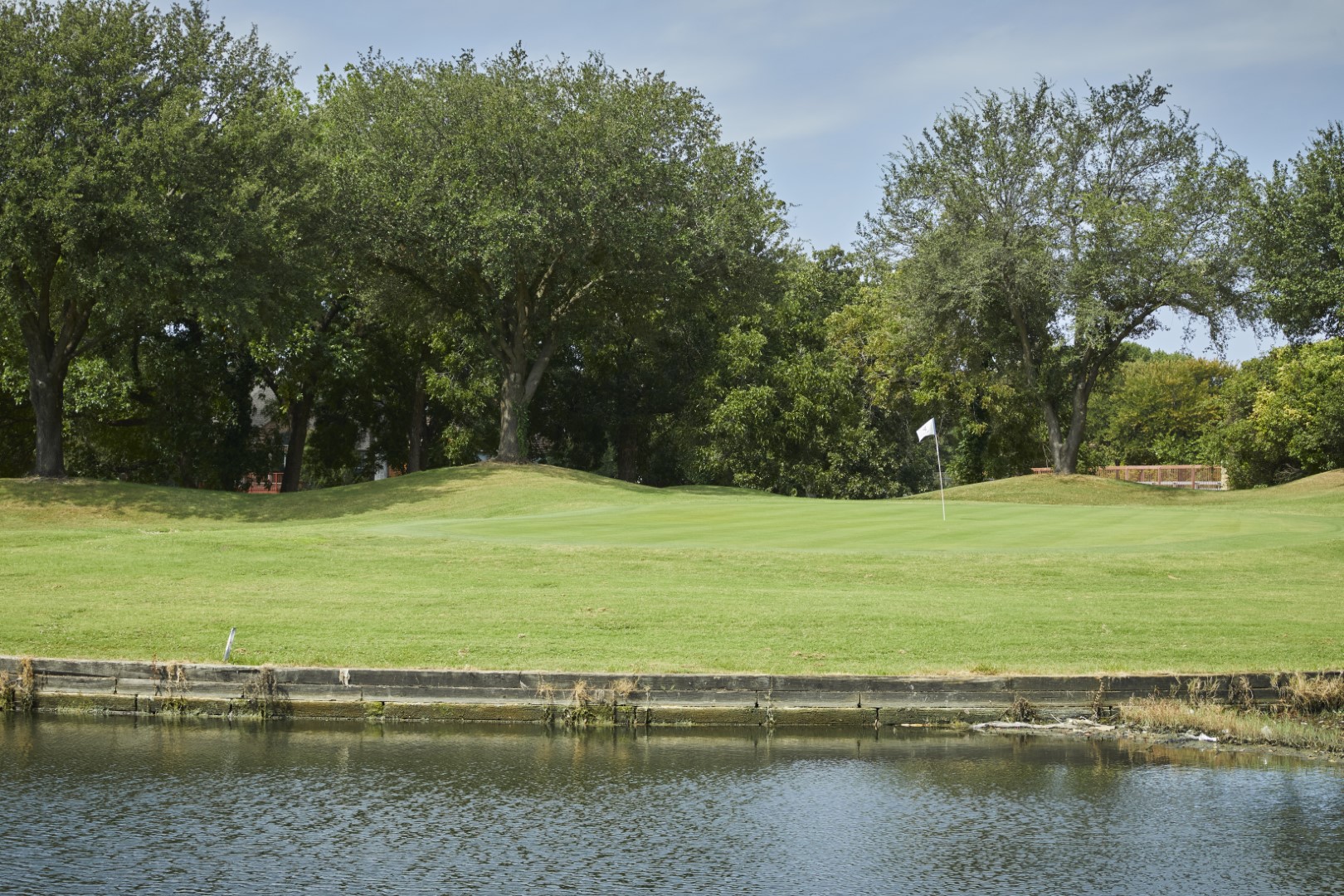 Most players opt for a hybrid or long iron off the #1 tee box, to avoid running through the fairway to a pond at the bottom of the hill. The fairway leaves a relatively flat lie roughly 140 yards from the green, where it then begins to slope towards the pond at the end of the fairway