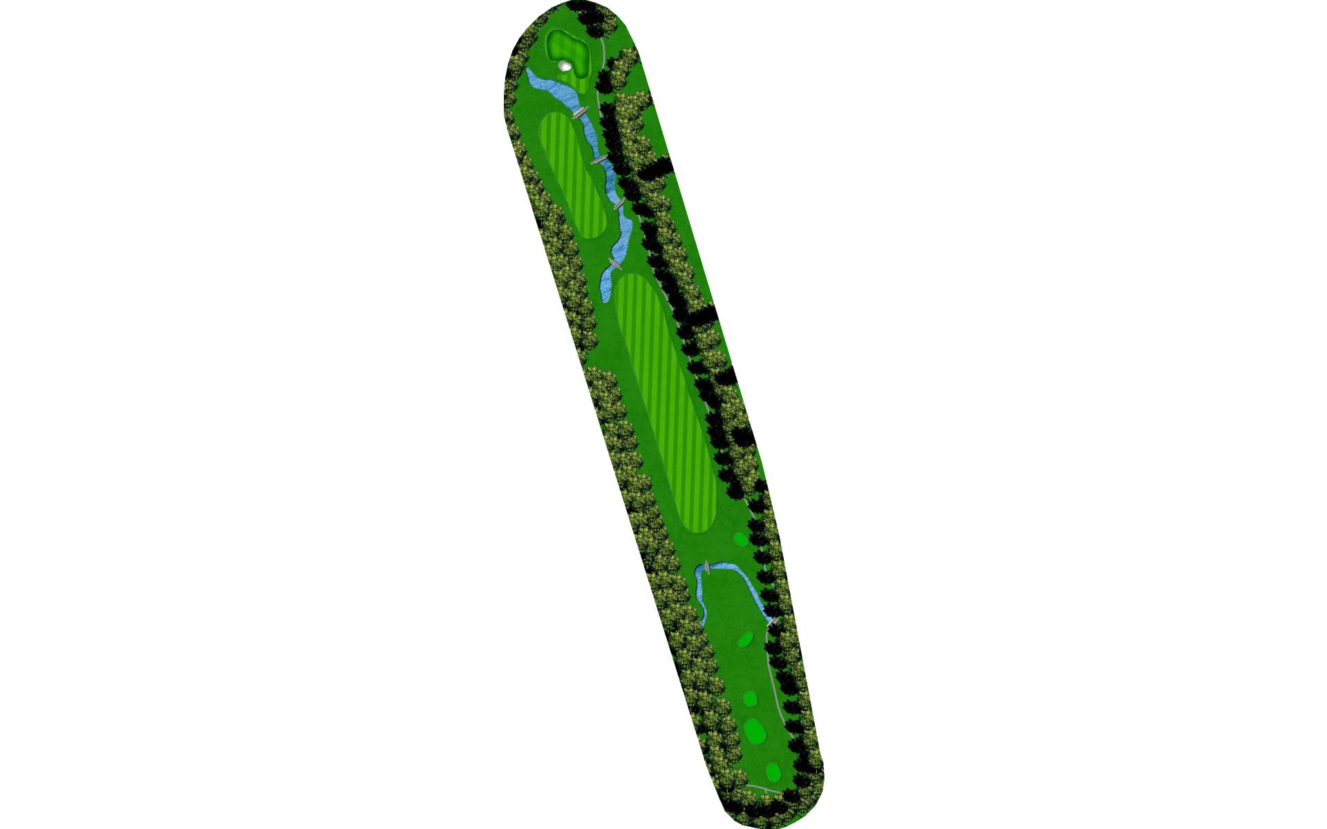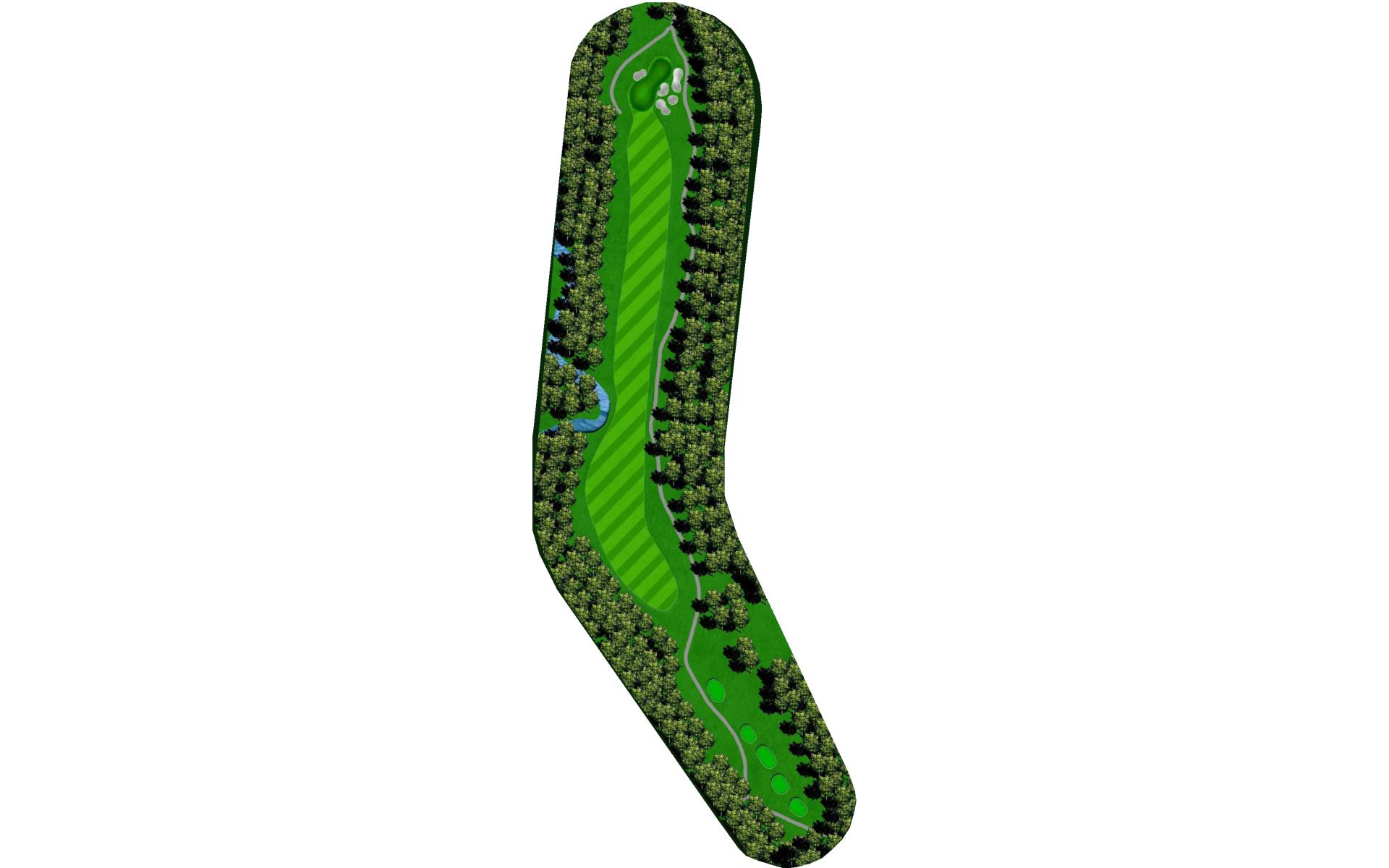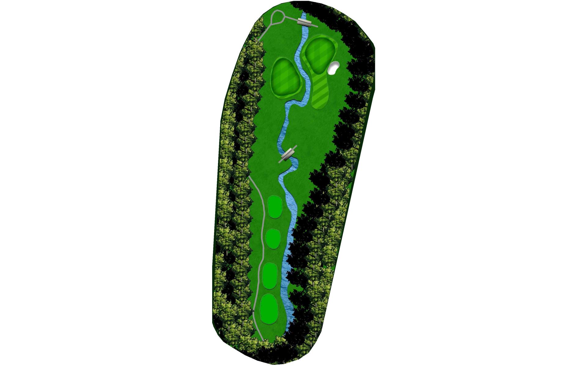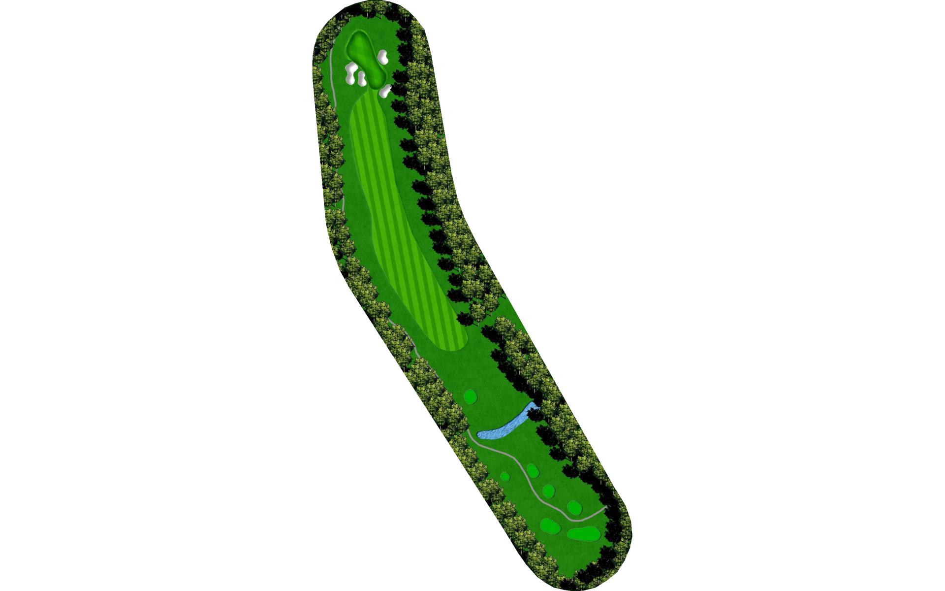 The course opens with a relatively straight par 4 with a fairway that slopes left-to-right. The approach shot will have to navigate a creek that runs across the front of the green and a bunker short left. This green slopes back-to-front.