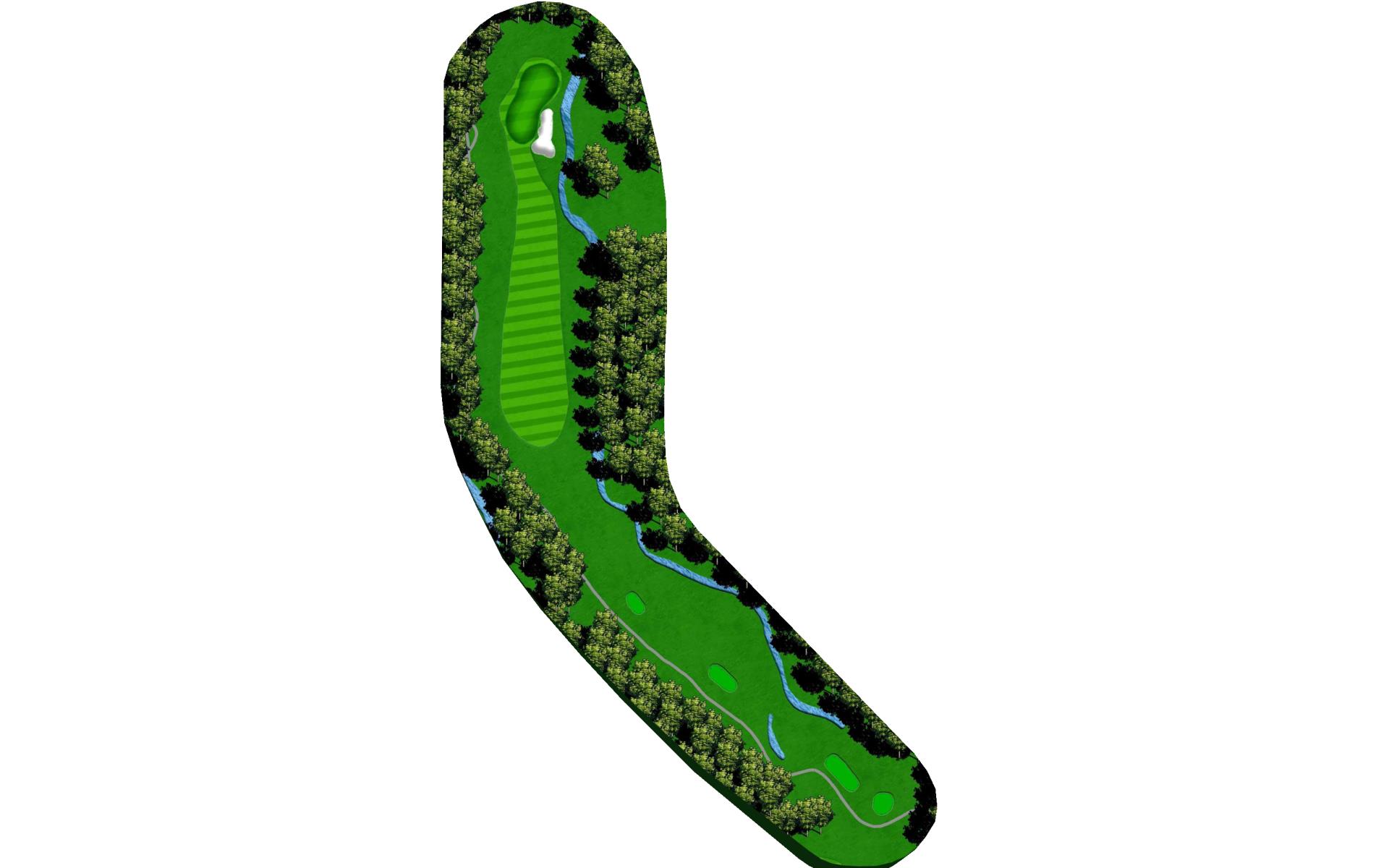 This short, downhill par 4 requires less than a driver off the tee. A creek runs down the left side of the hole and cuts across the front and right side of the green. The putting surface slopes back-to-front.
