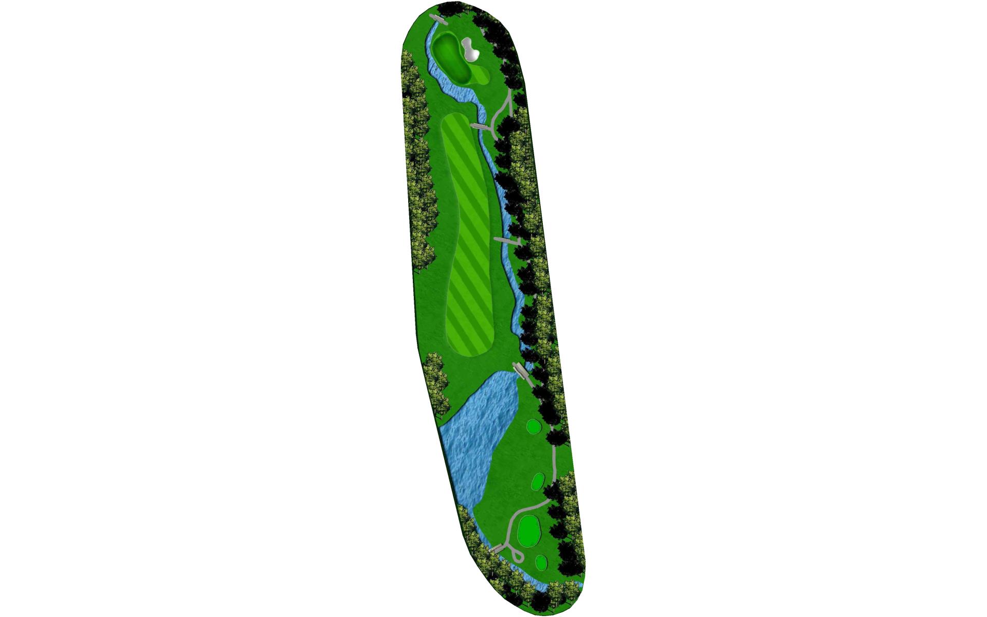 This short par 4 requires a drive to be placed down the left-center of the fairway that slopes left-to-right. A well placed drive will avoid the creek that runs down the right side of the hole, while setting up a good angle into the green, which is guarded by a tree short right. The green is also protected by a creek that wraps around the perimeter and a deep bunker on the right.