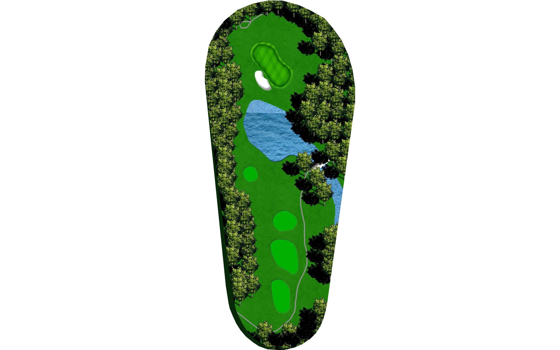 The green on this par 3 features a false front that can bring a short shot back into the pond. There’s also a deep bunker short left of the green that slopes left-to-right and back-to-front.