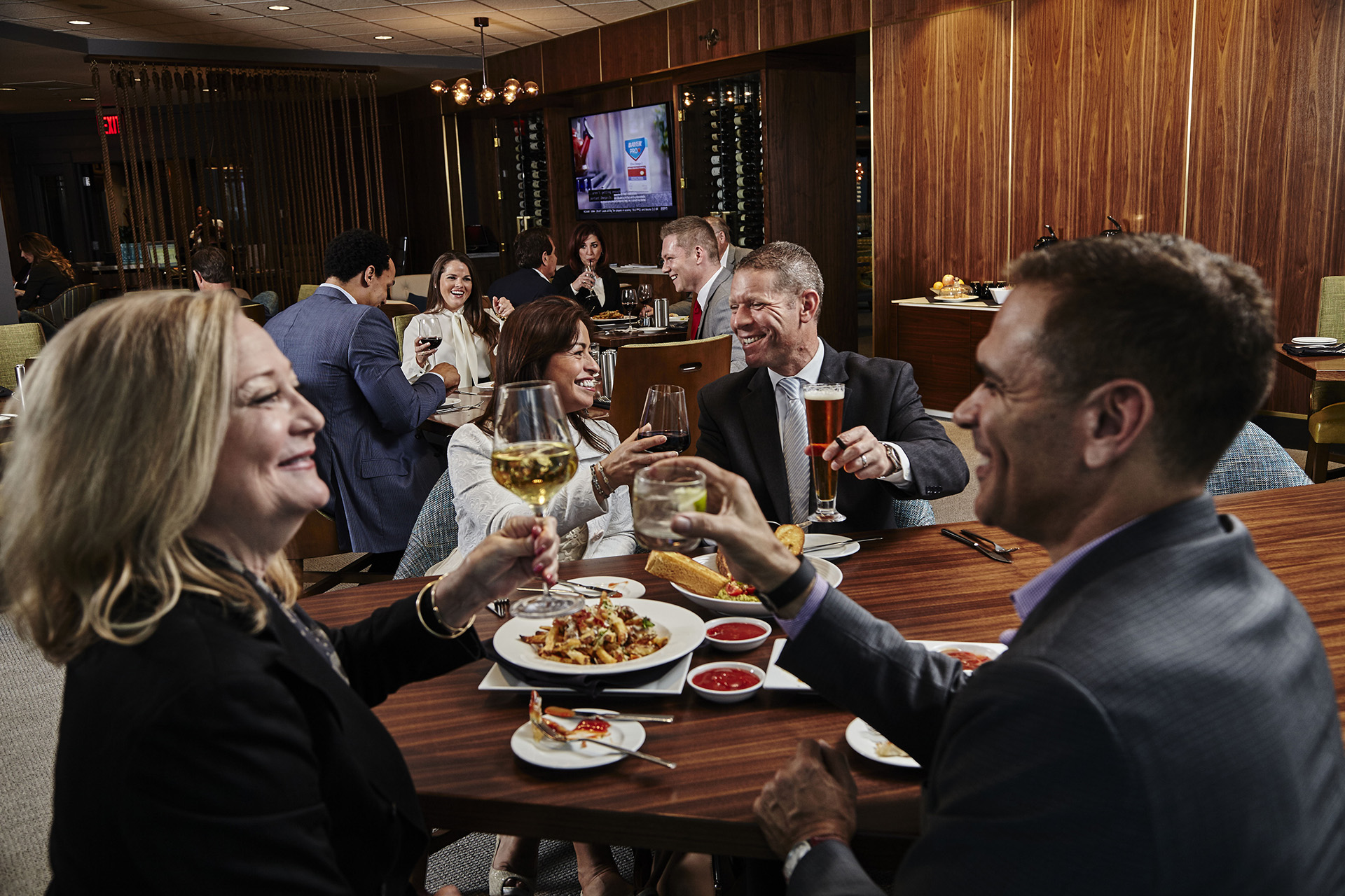Beer enthusiasts enjoy a diverse selection from our Craft Beer Cooler as well as featured Draft Beer selections. Trade Bar offers several wines by the glass and is equipped with a Wine Preservation System that allows for taste and glass pours from high-end wine normally only sold by the bottle. The joiner table is perfect for meeting up with friends or colleagues for a drink. Take advantage of our Eames chairs in the TV Lounge that offer the ultimate experience in comfort while watching a sports game on the 80” television screen.