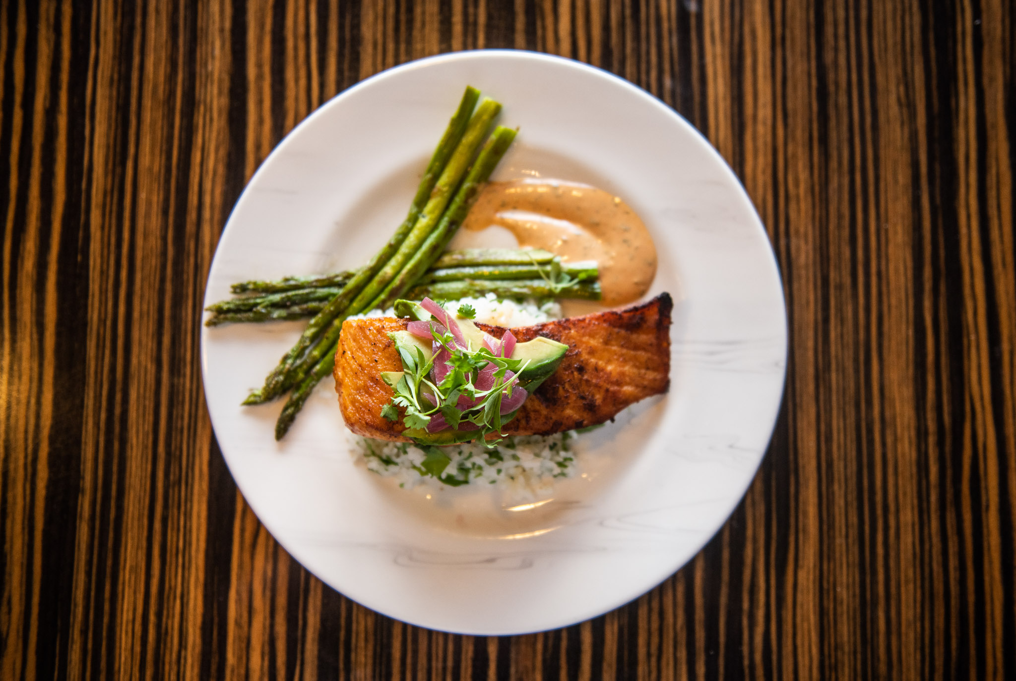 SERVED OVER CILANTRO LIME RICE WITH GRILLED ASPARAGUS